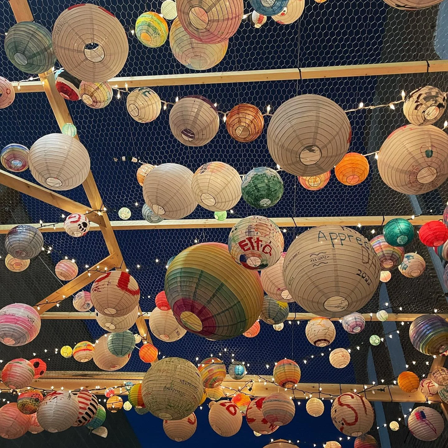 Lanterns decorated with answers to “what lights you up about Vermillion?” hang in the Pocket Park, October 2022.