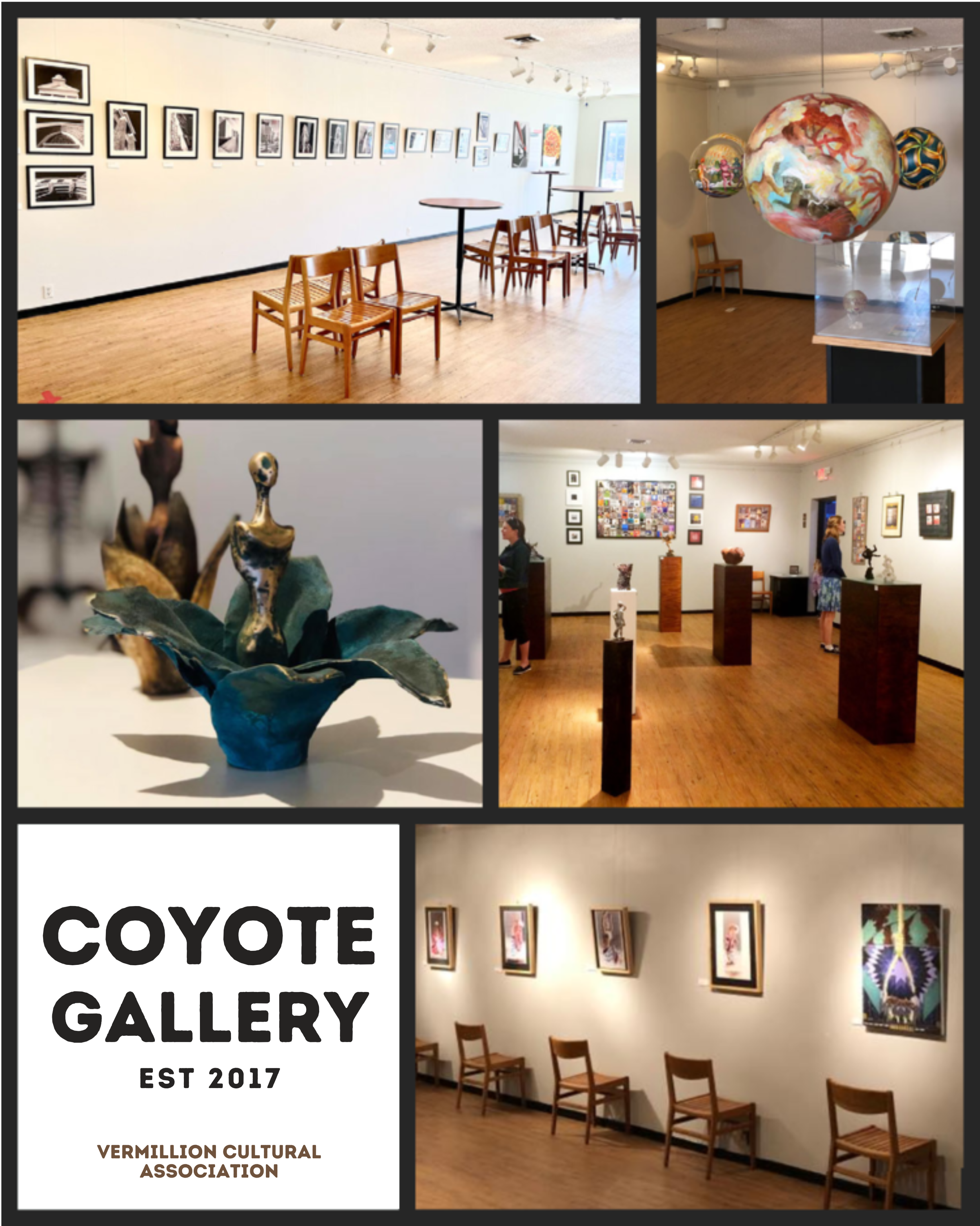The Coyote Gallery features 90 linear square feet of wall space (click here for diagram) and is suitable for display of visual art, small-scale receptions, performances, and workshops. The gallery is overseen by the executive director of the Vermillion Cultural Association, maintained by the manager and staff of the adjacent Coyote Twin Theater, and often retains the help of volunteers. You can learn more by previewing our exhibition agreement.